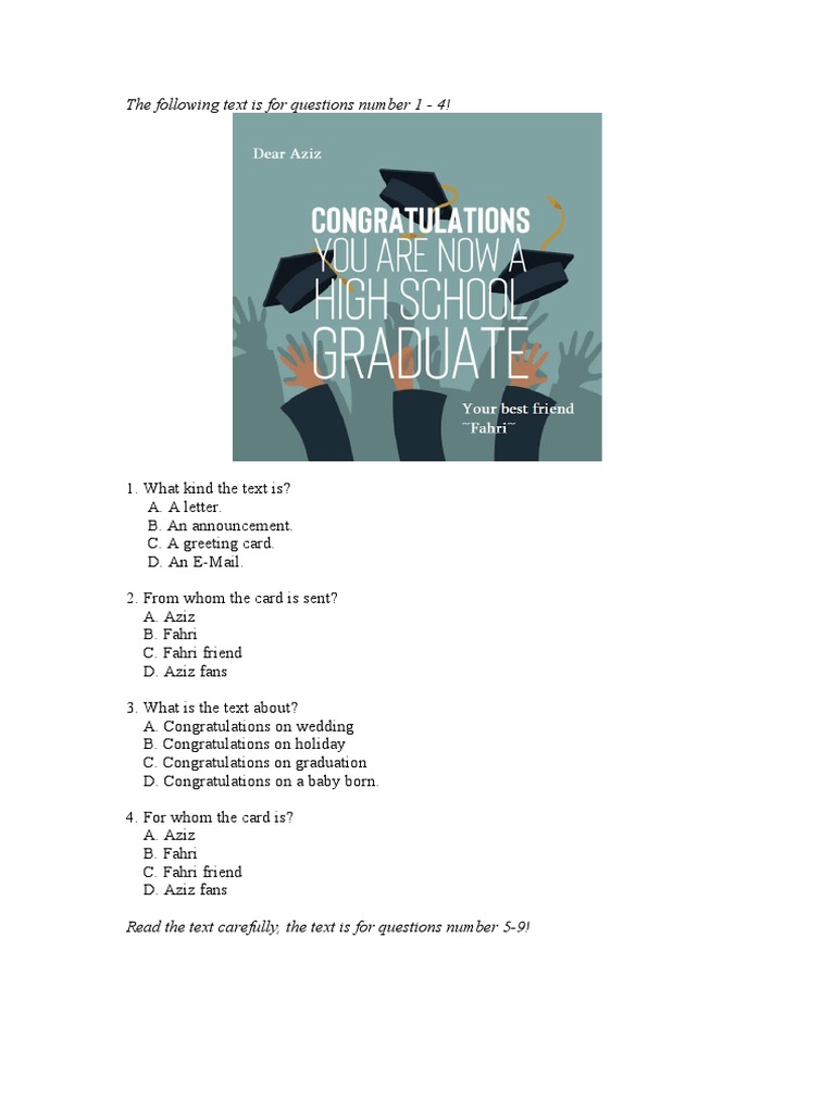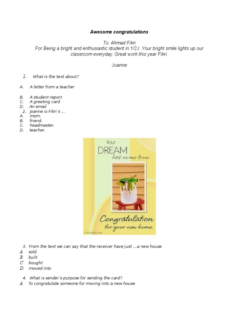 From the text we know that fahmi…. Read the following greeting card and answer question below! She is a student 3. From the text, we can conclude that. Ada berbagai bentuk greeting card, misalnya kartu ucapan selamat, duka cita/simpati, dan lainnya. 20022017 200 contoh soal bahasa inggris lengkap dengan kunci jawaban dan pembahasan pengertian dan contoh asking for offering and accepting things dalam kalimat bahasa inggris pengertian indefinite adjective dan cara. 10 latihan soal greeting card jawabanya. What is the text about? Soal latihan un smkmak bahasa inggris 2018 2019 plus. There are several websites on the internet that soal greeting card essay would offer you affordable packages for the service soal greeting card essay they are providing; Congratulations on your success as the winner of the youth scientific contest 2015. Rangkuman materi greeting card/wishing card merupakan salah satu text fungsional yang munculdalam soal un (skl no2) greeting card adalah text yang berupa kartu ucapan yang diberikan kepada seseorang pada saat tertentu/mengalami peristiwa tertentu, baik peristiwa yang menggebirakan maupun peristiwa yang menyedihkan. 50 soal mutasi pilihan ganda dan kunci jawaban pembahasan penggunaan cause connectors because because of so that dan so such yureka education center.